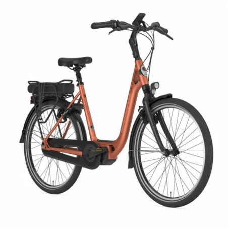 Voici le GAZELLE Ami C7 HMS H7 un vélo électrique de ville, aux couleurs cuivrées.